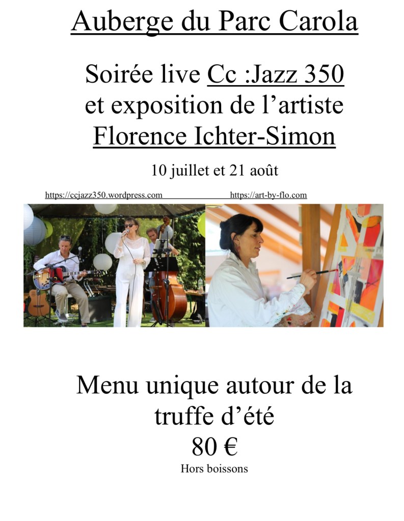 Exposition à l’Auberge du Parc Carola à Ribeauvillé 01/08/202129/05/2022 / Florence Ichter-Simon Du 10 juillet au 31 août Florence presentera une sélection de ces dernières œuvres dans ce haut lieux de la gastronomie . Share this: Click to share on X (Opens in new window) X Click to share on Facebook (Opens in new window) Facebook Like Loading... Related